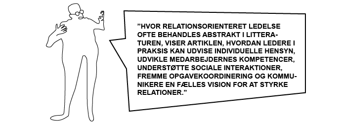 Relationsorienteret ledelse rummer et betydeligt potentiale for at styrke sociale relationer og understøtte samarbejde i organisationer. Men hvordan ser denne ledelsesform ud i praksis? Med afsæt i en nyere teoretisk ramme og kvalitative interviews med ti ledere fra en dansk kommune præsenterer artiklen fem centrale dimensioner af relationsorienteret ledelse og omsætter dem til konkrete ledelseshandlinger med illustrative praksiseksempler. Artiklen diskuterer desuden udfordringer og muligheder i relationsorienteret ledelsespraksis og introducerer nærhed som analytisk perspektiv ved at skelne mellem fysisk tilstedeværelse, digital tilgængelighed og mentalt nærvær. For at understøtte lederes udvikling af relationsorienteret ledelse formuleres desuden en række refleksionsspørgsmål og en praksisnær inspirationsliste.