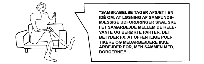 Grundtanken i samskabelse er at etablere ligeværdige samarbejder på tværs af de samfundsmæssige sektorer, der traditionelt har været adskilt: Det offentlige, civilsamfundet og virksomhederne. Centralt i denne tilgang står en ambition om at invitere borgere og civilsamfund ind som ligeværdige samarbejdspartnere og medskabere. At opfatte dem som ressourcer, der kan og skal spille en aktiv rolle i udvikling af politik og konkrete tiltag. Samskabelse tager afsæt i en idé om, at løsning af samfundsmæssige udfordringer skal ske i et samarbejde mellem de relevante og berørte parter. Det betyder fx, at offentlige politikere og medarbejdere ikke arbejder for, men sammen med, borgerne (Tortzen, 2019; Tortzen & de Jongh, 2021). Her er tale om en grundlæggende ændring i det offentliges rolle – fra myndighed til partner og facilitator af samarbejde mellem mange forskellige parter (Tortzen, 2019).