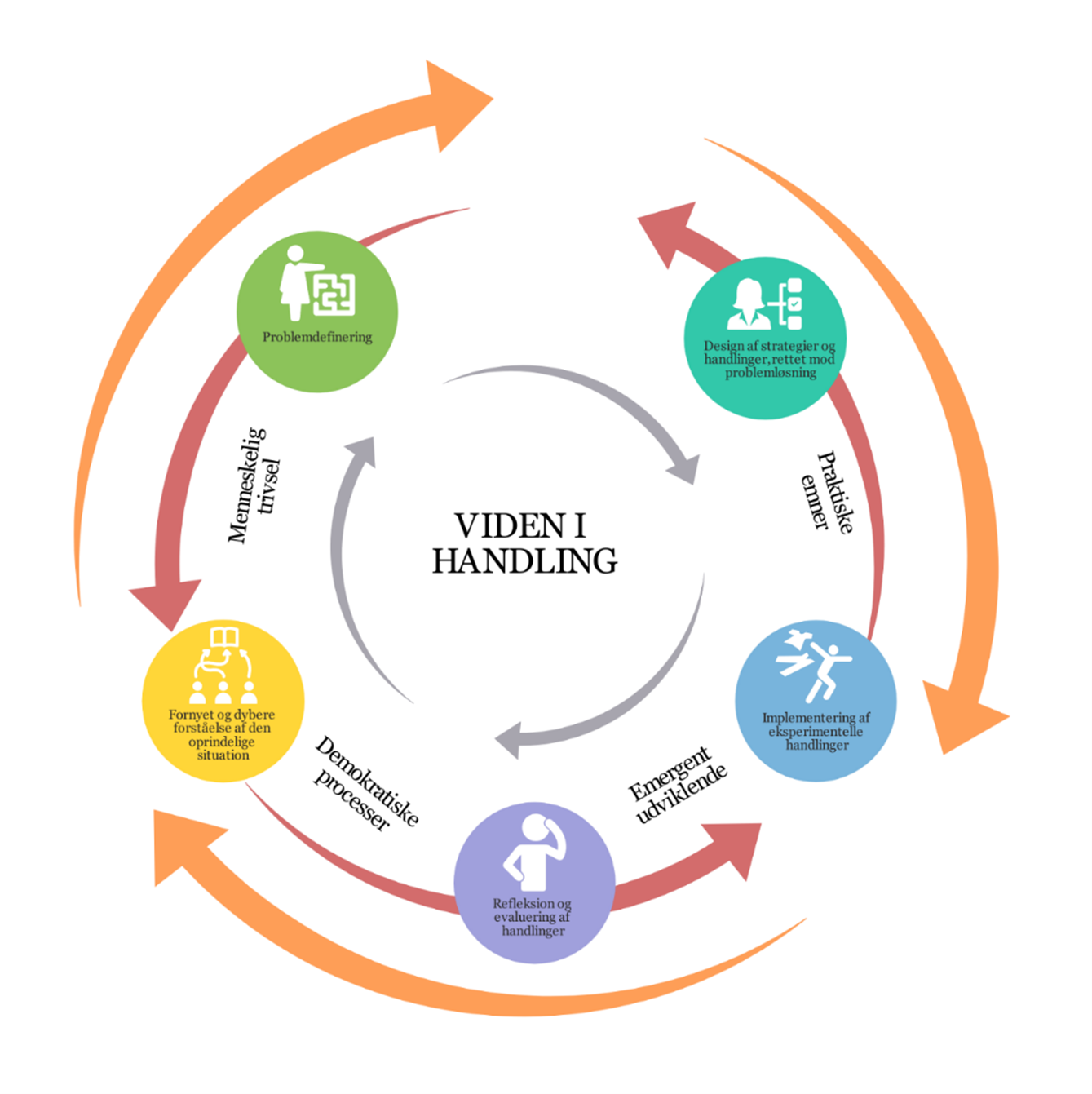”… kendetegnet ved cykliske undersøgelses- og læringsprocesser, som indledes med en problemdefineringsproces, der efterfølges af design af handlinger og strategier rettet mod problemløsning, og som herefter bevæger sig videre til implementering af de eksperimentelle handlinger for at afsluttes med en refleksion og en evaluering af disse handlinger, der fører til en fornyet og dybere forståelse af den oprindelige situation” (Frandsen 2016: 72)