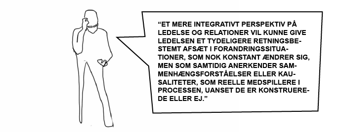 Et mere integrativt perspektiv på ledelse og relationer vil kunne give ledelsen et tydeligere retningsbestemt afsæt i forandringssituationer, som nok konstant ændrer sig, men som samtidig anerkender sammenhængsforståelser eller kausaliteter, som reelle medspillere i processen, uanset de er konstruerede eller ej. – Relationelle processer, ud fra Hersted, er selvsagt betydningsfulde i organisationslivet, men først når de gives retning og integrerer eksisterende (objektiv) viden af relevans. I det efterfølgende undersøger jeg tidligere nævnte alternative erkendelseskvaliteter i ledelsens udkantsområde, som udfordrer den dualisme, jeg hidtil har skitseret inden for klassisk realisme og konstruktionsteorier.